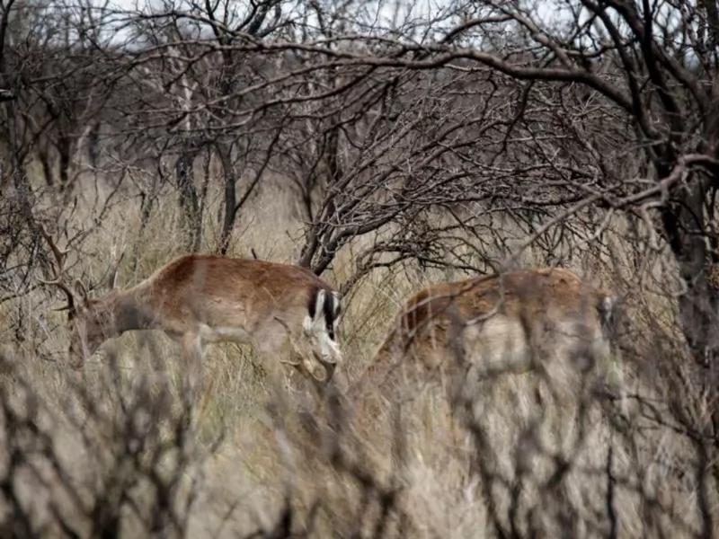 The ranch has a private hunting area of 470 acres high fence and 5486 acres free range . La Pampa landscape is mainly flat, with soft hills and thick bushes.